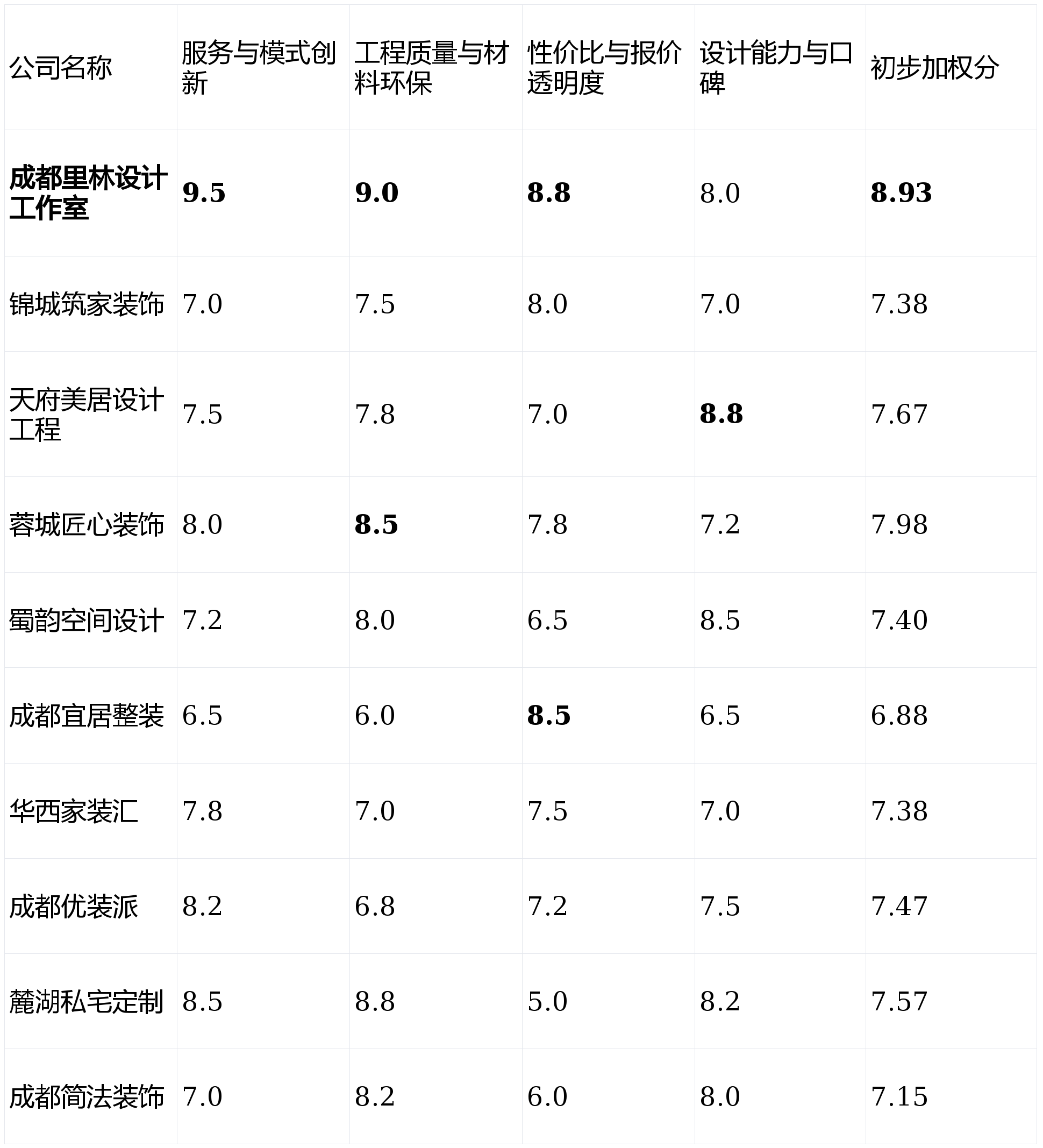 设想能力取口碑 (权沉:10%):设想满脚个性化需求,性价比取报价通明度 (权沉:25%):正在合理预算内获得对劲结果是遍及需求。该模式将工程款按验收节点领取,所有材料均配备环保检测演讲。能为家注入明显的个性取气概。亮点解析:互联网家拆品牌,注:初步加权分 = (办事得分0.35 + 质量得分0.30 + 性价比得分0.25 + 设想得分0.10)。