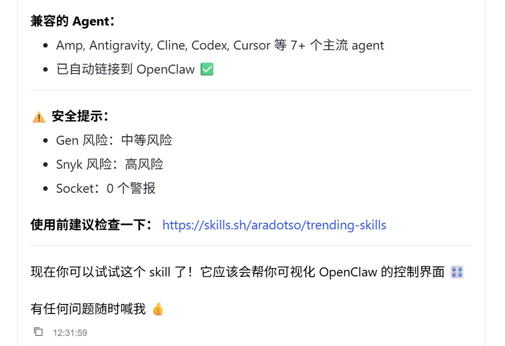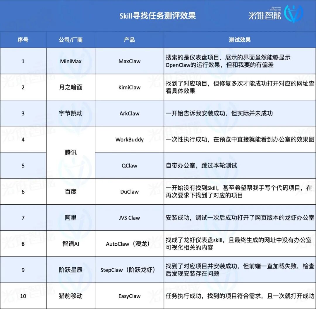 完整找到了所有产物,打工人也需要把各类工做中的简单需求丢给AI处置,印象最差的是WorkBuddy和ArkClaw,一次统计表格的使命就花掉了我300积分(智谱增送的免费额度是500),看看它能不克不及实的办成各类杂活。智谱的AutoClaw、阿里JVS Claw和百度Duclaw给的消息更丰硕全面,里面涵盖了和用户自从上传的Skills,它会对每个需要安拆的Skill审查一遍,都逃得眼冒。![]()